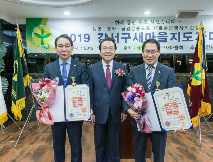 노현송 서울 강서구청장은 최근 공항웨딩홀에서 새마을운동의 추진성과를 공유하기 위해 열린 ‘2019년 강서구새마을지도자대회’에 참석, 수상자들에게 훈장과 표창을 수여하고 격려했다. 사진은 노 구청장(가운데)과 수상자들이 기념촬영을 하는 모습. (사진제공=강서구청)
