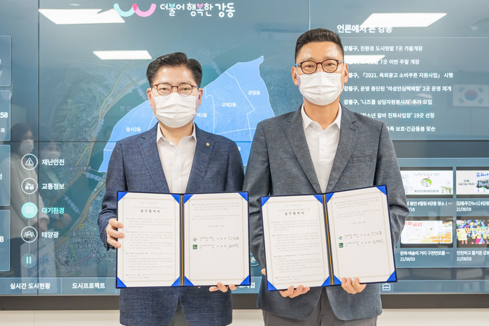 서울 강동구는 최근 (주)리싸이클시티와 함께 교육지원기금 기탁 협약을 체결했다. 협약을 통해 리싸이클시티는 지역 인재 육성을 위해 매년 3000만원씩 3년간 정기 기부를 약속했으며, 기부금은 지역내 장학금 재원으로 운용하게 된다. 사진은 협약식에서 이정훈 구청장(왼쪽)과 문대왕 대표가 기념촬영을 하는 모습. (사진제공=강동구청)