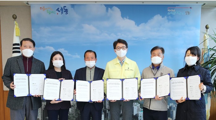 서울 성동구는 지난 13일 중대한 재난 발생시 마을버스 운영 중단을 방지하기 위해 마을버스 운수업체 공동대응을 내용으로 하는 협약을 체결했다. 협약으로 재난 발생시 구는 운수업체 간 공동대응하도록 즉시 개선명령 등 조치를 취할 수 있게 된다. 사진은 협약식에서 정원오 구청장(오른쪽 세 번째)과 관계자들이 기념촬영을 하는 모습. (사진제공=성동구청)