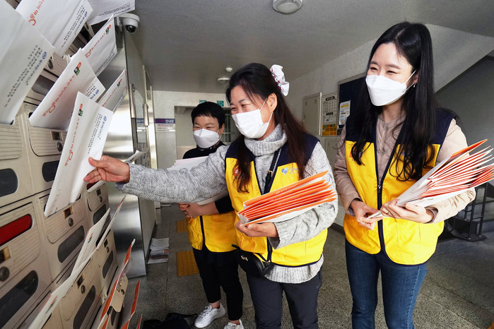 서울 동대문구가 최근 구민들의 심리적 방역을 위해 ‘비대면 마음건강 돌봄 활동’을 실시, 우울 검진표, 마음엽서, 우울십계명, 도움기관 정보, 방역물품(마스크 등) 등이 담긴 ‘마음건강우편물’ 꾸러미를 가정에 배포했다. 사진은 마음건강주민교육단이 아파트 우편함에 우편물을 넣고 있는 모습. (사진제공=동대문구청)