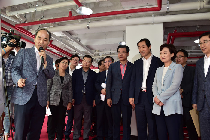 문석진 서울 서대문구청장이 21일 지역내 대현동 청년주택공사 현장에서 열린 '국토부-서울시 구청장 간담회'에서 김현미 국토부 장관과 청년주거지원을 위한 협력 방안을 논의했다. 사진은 관계자에게 설명을 듣고 있는 김 장관 및 구청장들의 모습. (사진제공=서대문구청)