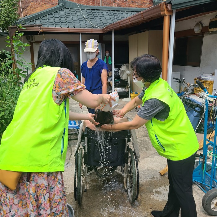 경기 의정부시 의정부1동 주민센터는 최근 거동이 불가한 청장년을 대상으로 저소득가구 생활안정 지원사업(깔끄미)을 연계해 홈클리닝을 진행하는 동시에, 집앞 마당에서는 오물로 뒤덮인 대상자의 몸을 씻겨내는 목욕봉사도 진행했다. 사진은 이날 봉사자들이 거동 불가 대상자를 씻겨주고 있는 모습. (사진제공=의정부시청)