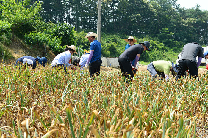 충남 홍성군의 지역 대표 작물인 토종 ‘홍산마늘’이 제철을 맞아 수확이 한창이다. 홍산마늘은 농촌 진흥청에서 개발한 국내 최초 전국 재배가 가능한 신품종 마늘이다. 사진은 최근 한 노악에서 홍산마늘을 수확하고 있는 모습. (사진제공=홍성군청)