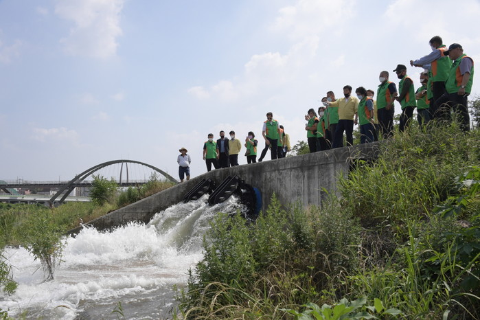 최용덕 경기 동두천시장은 2일 상패2 및 보산2 빗물펌프장에 대해 동두천시 지역자율방재단원과 함께 현장을 점검했다. 현장점검은 본격적인 여름 장마철 집중호우에 대비해 신속하고 능동적으로 대처하기 위해 실시됐다. 사진은 최 시장과 관계자들이 빗물펌프장 수문 등 배수시설을 살펴보고 있는 모습. (사진제공=동두천시청)