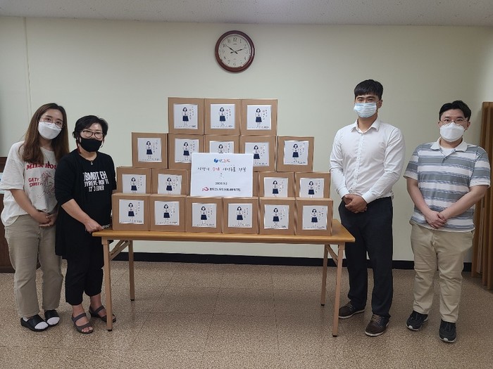 경기 동두천시사회복지협의회 무한돌봄네트워크팀는 지난 2일 국제 NGO단체 월드프렌즈로부터 수제여성용품 20상자를 후원받았다. 이 물품은 생계 곤란으로 여성용품 구입이 힘든 대상자들에게 비대면 방법으로 전달할 예정이다. 사진은 전달식에서 관계자들이 기념촬영을 하는 모습. (사진제공=동두천시청)