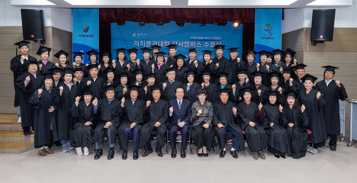 서울 강서구는 16일 강서평생학습관에서 '제1기 자치분권대학 강서캠퍼스' 수료식을 개최했다. 사진은 이날 수료식에 참석한 노현송 구청장(앞줄 오른쪽에서 여섯 번째)이 졸업생들에게 수료증을 전달한 후 함께 기념촬영을 하는 모습. (사진제공=강서구청)