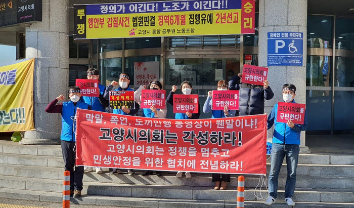 공노조는 지난 3일 시의회 앞에서 ‘막말, 폭언, 도끼만행 동영상이 웬 말이냐’,‘고양시의회는 각성하라’는 현수막을 걸고 시의회를 규탄했다.