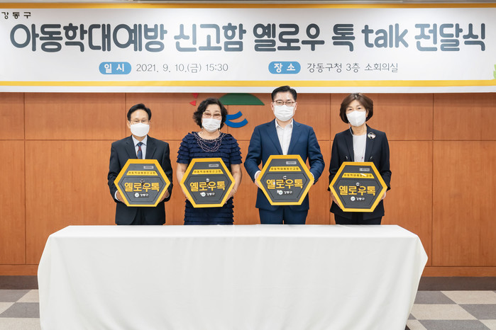 서울 강동구가 최근 지역내 초등학교(한산초·강일초·명일초)에 설치할 아동학대예방 신고함 ‘옐로우 톡 talk’ 전달식을 개최했다. 초등학교 정문이나 후문에 신고함을 설치해 아동학대가 의심될 경우 누구나 손쉬운 신고가 가능하다. 사진은 전달식에서 이정훈 구청장(오른쪽 두 번째)과 관계자들이 기념촬영을 하는 모습. (사진제공=강동구청)