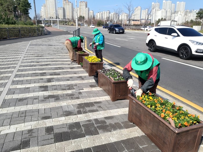 경기 김포시 마산동 행정복지센터는 최근 남녀 새마을회원 20여명과 함께 지역내 도로변(버스정류장 등)에 팬지, 비올라 등 1000여본을 식재했다. 이들은 이와 더불어 길거리 환경 정화활동도 했다. 사진은 새마을회원들이 봄꽃을 심고 있는 모습. (사진제공=김포시청)