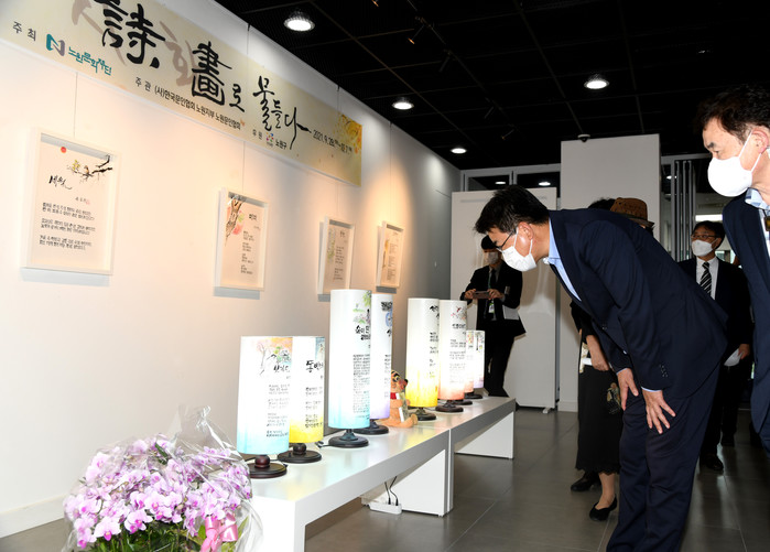 오승록 노원구청장은 28일 노원문인협회 초대전 <詩(시), 畵(화)로 문들다> 오프닝 행사에 참석했다. 이번 전시에서는 노원문인협회 회원들의 작품 약 40점을 선보인다. 사진은 오 구청장(오른쪽에서 두 번째)이 오프닝 행사에 참석해 작품을 감상하고 있는 모습. (사진제공=노원구청)