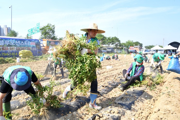 새마을운동 하남시지회는 지난 23일 80여명의 회원이 참여한 가운데 경기 하남시 선동에 위치한 1000여평의 휴경 농지에서 직접 키운 감자를 수확했다. 사진은 이날 참여한 김상호 시장(가운데)이 회원들과 함께 땀을 흘리며 감자를 수확하고 있는 모습. (사진제공=하남시청)