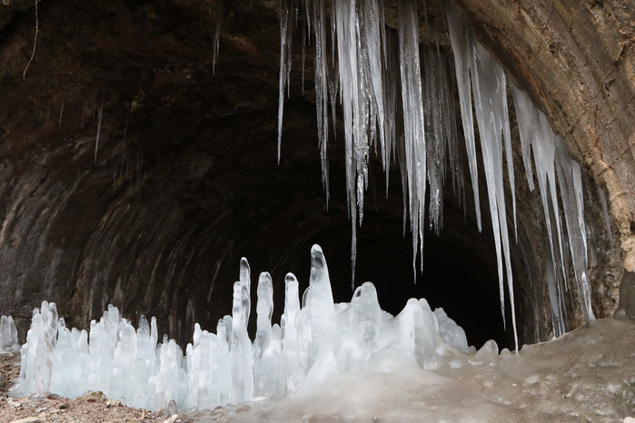 절기 상 소한(小寒)인 6일 경기 연천군 신서면 고대산의 경원선 폐터널에서 역고드름이 바닥에서 자라고 있다. 이 터널은 천장에 생긴 틈과 온도차이로 물방울이 바닥으로 떨어지면서 매년 겨울마다 고드름이 동굴 종유석처럼 자라고 있다.