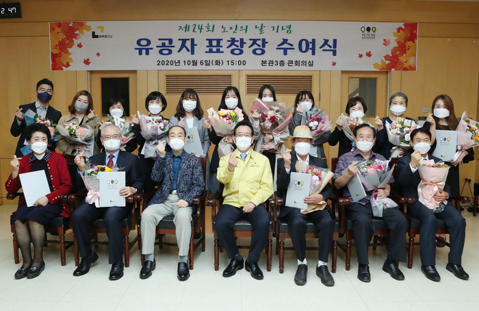 서울 강남구는 6일 '노인의 날'을 맞아 모범노인·노인복지기여자·노인복지기여단체 등 총 17명에게 표창장을 수여했다. 사진은 수여식에서 정순균 구청장(앞줄 가운데)이 수상자들과 기념촬영을 하고 있는 모습. (사진제공=강남구청)