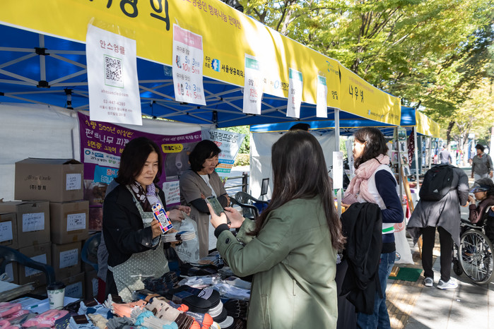 서울 광진구가 최근 나루아트센터 광장에서 광진구상공회와 함께하는 ‘중소상공인 행복나눔 판매전’을 개최했다. 사진은 ‘행복나눔 판매전’을 찾은 주민들이 물건을 구경하고 있는 모습. (사진제공=광진구청)