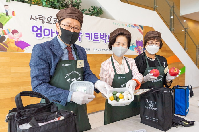 서울 양천구는 최근 추석 연휴기간 아동급식 특별대책으로 취약계층 아동을 위해 20여가지의 식료품으로 구성된 명절연휴 사흘 분의 ‘엄마도시락’ 키트를 준비해 배달했다. 사진은 김수영 구청장(가운데)이 엄마도시락 키트박스를 포장하고 있는 모습. (사진제공=양천구청)