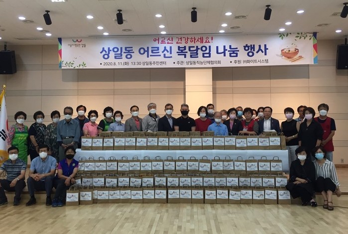 서울 강동구 상일동이 11일 지역내 저소득 노인의 건강한 여름나기를 위한 ‘복달임 나눔행사’를 열었다. 올해는 코로나19 감염 예방을 위해 삼계탕·떡 등을 포장해 전달하는 방식으로 진행했다. 사진은 나눔행사 관계자들이 기념촬영을 하고 있는 모습. (사진제공=강동구청)