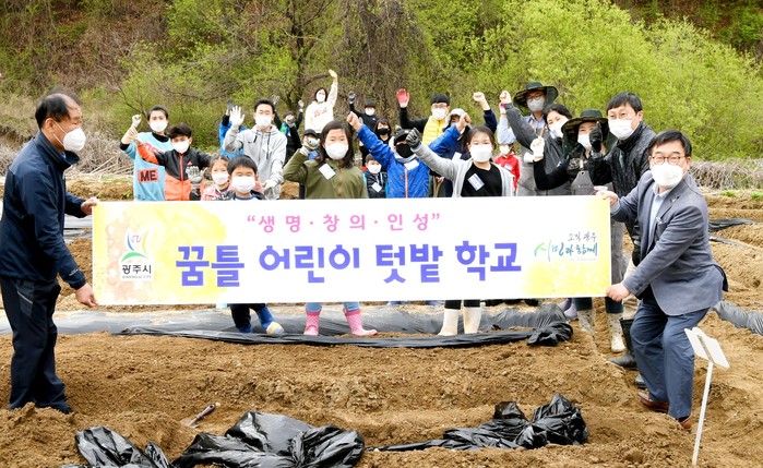경기 광주시가 최근 민영도시농업농장인 대림 배농원에서 '꿈틀 어린이 텃밭학교' 수업을 시작했다. 꿈틀 학교는 시 도시농업관리사들의 지도로 운영되며, 이달 감자심기를 시작으로 다양한 친환경 작물재배를 할 예정이다. 사진은 이날 수업에 참여한 신동헌 시장(앞줄 오른쪽)이 참여 가족들과 기념촬영을 하는 모습. (사진제공=광주시청)