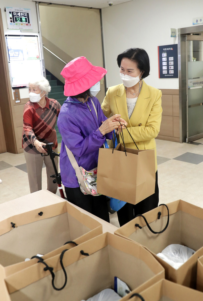 서울 양천구 복지관내 경로식당은 197일 만에 문을 열고 백신 2차 접종까지 마친 노인들을 대상으로 7일부터 식당에서 점심을 먹을 수 있도록 준비했다. 사진은 김수영 구청장(오른쪽)이 백신 1차 접종을 한 노인들에게 도시락을 배부하는 모습. (사진제공=양천구청)