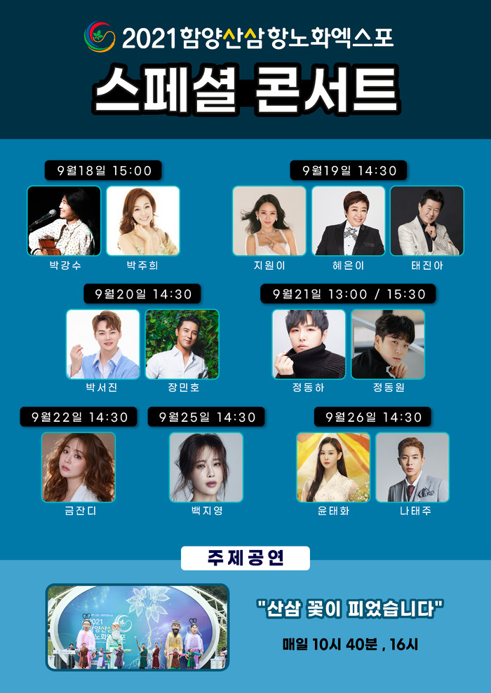 미스터트롯의 간판스타, 장민호, 정동원, 나태주를 비롯하여 명품보이스를 자랑하는 백지영, 태진아, 정동하 등 정상급 가수들로 구성되는 엑스포 성공기원 스페셜 콘서트는 추석연휴 동안 2021함양산삼항노화엑스포 제1행사장 메인무대에서 만나볼 수 있다.