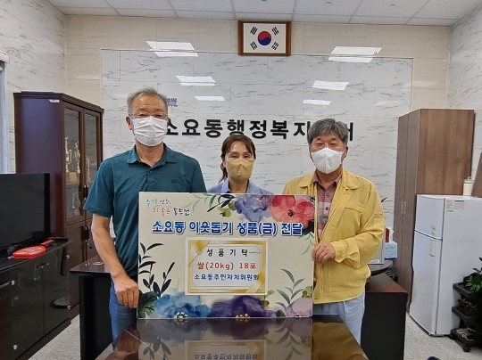 경기 동두천시 소요동주민자치위원회는 13일 어려운 이웃들을 위해 소요동행정복지센터에 백미 20kg, 18포(120만원 상당)를 기탁했다. 사진은 관계자들이 기념촬영을 하는 모습. (사진제공=동두천시청)