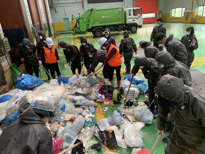 경기 수원시 팔달구 행궁동은 지난 1일 행궁동장, 주민 등 25여명이 참여한 가운데 수원시 자원회수시설에서 '생활쓰레기 샘플링 점검'을 실시했다. 참여자들은 쓰레기 소각 처리시설을 방문해 쓰레기 처리과정을 눈으로 확인하고 직접 쓰레기봉투를 파봉해 배출실태를 점검했다. 사진은 참여자들이 쓰레기봉투를 파봉하고 있는 모습. (사진제공=팔달구청)