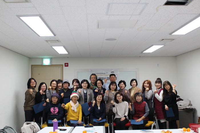 서울 금천구는 최근 독산2동 주민센터 강의실에서 교육나눔협동조합 ‘마을해설사 양성과정 수료식’을 했다. 사진은 수료식에 참석한 수료생들이 기념촬영을 하고 있는 모습. (사진제공=금천구청)