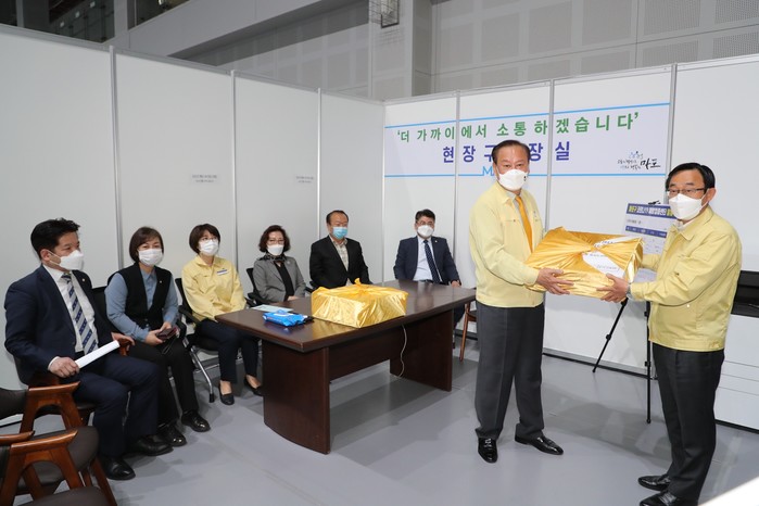 유동균 서울 마포구청장과 마포구의회 복지도시위원회 의원들은 10일 마포구민체육센터에 마련된 코로나19 백신 예방접종센터를 방문했다. 사진은 이날 유 구청장(오른쪽에서 두 번째)이 현장직원을 위한 격려물품을 전달하고 있는 모습. (사진제공=마포구청)