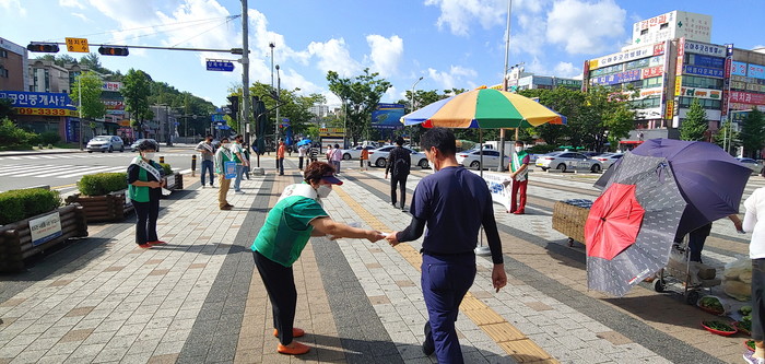 경기 안산시새마을회는 최근 코로나19 확산 방지를 위해 상록수역 앞에서 ‘마스크 나눔행사’를 실시했다. 이날 캠페인에서는 (주)에스와이인더스트리로부터 후원받은 마스크 4만장을 시민들에게 나눠주면서 마스크 착용의 중요성을 알렸다. 사진은 새마을회 관계자들이 시민에게 마스크를 나눠주고 있는 모습. (사진제공=안산시청)