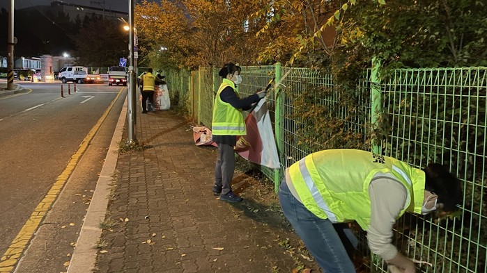 경기 수원시 장안구는 26일 영화동·조원동 지역을 중심으로 도로변에 설치돼 시민 안전을 위협하는 현수막·벽보·LED전광판 등 31건의 불법유동광고물에 대해 야간단속을 실시했다. 사진은 이날 합동단속반이 불법광고물을 정비하고 있는 모습. (사진제공=장안구청)