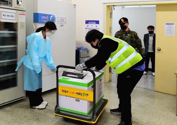 서울 중랑구 예방접종센터인 중랑문화체육관에 30일 75세 이상 노인을 대상으로 하는 5850명 분량의 화이자 백신이 안전하게 도착했다. 사진은 백신수송 담당자가 중랑구 예방접종센터로 백신을 옮기고 있는 모습. (사진제공=중랑구청)