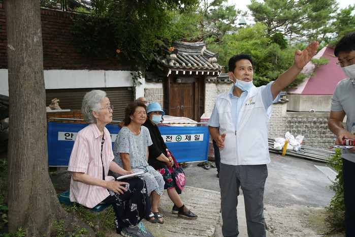 [시민일보 = 이대우 기자] 서울 종로구의회 정재호 의원은 삼청동 친환경 계단 조성 공사 현장을 찾아 동네 노인들의 의견을 청취하고 안전한 공사를 당부했다.