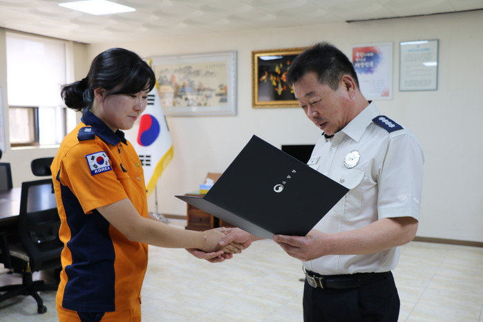 김동권 서장은 “쉬는 날임에도 불구하고 교통사고현장을 목격하고, 소방관 본연의 임무에 충실한 이단비 소방사에게 격려와 감사의 말을 전하며, 소방관으로서 큰 모범이 되었다” 라고 전하였다.