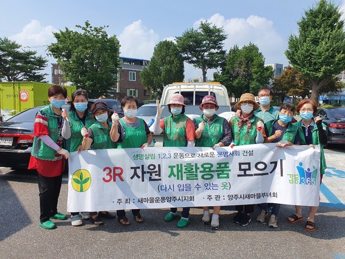 경기 양주시 광적면 새마을부녀회는 지난 17일 재활용이 가능한 자원을 수거하는 3R 자원 재활용품 모으기 활동을 실시했다. 3R은 재사용(Reuse), 재활용(Recycle), 발생줄이기(Reduce)의 첫머리를 딴 환경운동으로 폐기물 배출량을 줄이고 재사용·재활용하는 환경정화운동이다. 사진은 이날 참여한 회원들이 기념촬영을 하는 모습. (사진제공=양주시청)