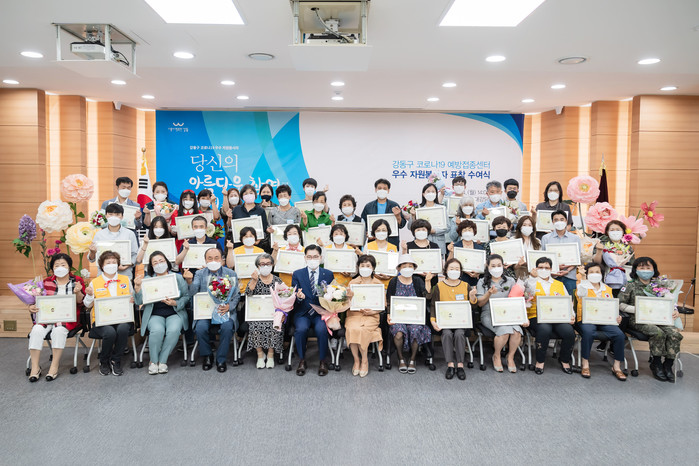 이정훈 서울 강동구청장이 지난 14일 코로나19 예방접종센터의 원활한 운영을 위해 헌신한 우수 자원봉사자에게 그동안의 노고에 격려하고 감사함을 표하기 위해 표창장을 수여했다. 우수 활동 자원봉사자 표창 수상자는 총 55명(단체 34명·개인 21명)이다. 사진은 표창 수여식에서 이 구청장(앞줄 가운데)과 수상자들이 기념촬영을 하고 있는 모습. (사진제공=강동구청)