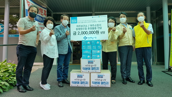 경기 여주시 보건소는 지난 23일 여주한글시장 상인회로부터 '덕분에 챌린지'를 통해 코로나19 예방을 위한 마스크 2500장(약 200만원 상당)을 기증받았다. 사진은 여주한글시장 관계자들이 마스크 전달 기념촬영을 하고 있는 모습. (사진제공=여주시청)
