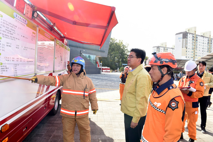 노원구는 29일 서울시립과학관에서 ‘2019 재난대응 안전한국훈련 산불 및 다중이용시설화재 대비훈련’을 했다. 사진은 훈련현장에 방문한 오승록 구청장이 소방서 관계자로부터 훈련 진행 상황을 보고받는 등 재난 상황 회의를 하는 모습. (사진제공=노원구청)
