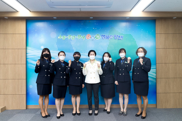 김수영 양천구청장이 19일 양천녹색어머니연합회 임원단과 만나 어린이 통학로 안전을 당부했다. 이들은 안전속도 5030 정책 홍보와 어린이 등굣길 교통안전을 위해 협력하기로 했다. 사진은 김 구청장(가운데)이 연합회 임원단과 기념촬영을 하고 있는 모습. (사진제공=양천구청)