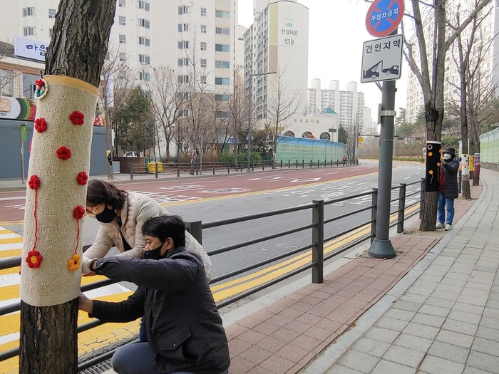 경기 수원시 장안구 조원2동은 최근 송원초등학교 인근 가로수에 겨울옷을 입히고 한일타운 아파트 주변에 트리조명을 설치했다. 가로수에 겨울옷을 입히면 가로수 동사 방지와 병해충 예방에 효과가 있고, 화사해진 거리는 주민들에게 이색적인 볼거리를 제공한다. 사진은 한일타운 조경공동체 ‘한일두레’ 회원과 주민들이 가로수에 헌옷을 재활용해 만든 손뜨개 옷을 입히고 있는 모습. (사진제공=장안구청)
