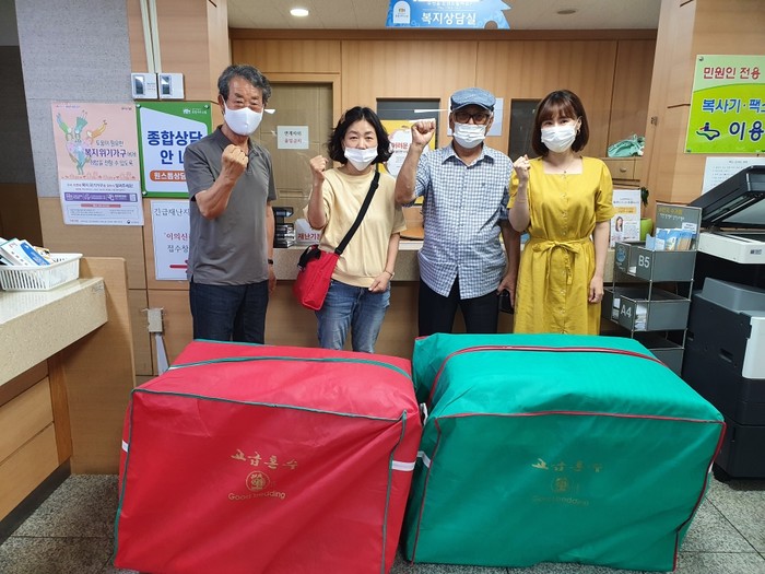 경기 수원시 팔달구 팔달문 시민상가 시장상인회는 최근 행궁동 쪽방 거주자와 홀몸노인 등 취약계층 42가구에 여름 이불을 전달했다. 사진은 전달식에서 상인회원들이 기념촬영을 하는 모습. (사진제공=팔달구청)