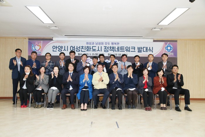 경기 안양시가 25일 '안양시 여성친화도시 정책네트워크' 발대식을 열고 본격적인 활동을 알렸다. 이날 위촉된 네트워크 위원들은 앞으로 여성친화 정책 추진을 위한 자문역할을 하게 된다. 사진은 최대호 시장(앞줄 가운데) 및 관계자들이 기념촬영하는 모습. (사진제공=안양시청)