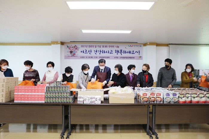 서울 강동구 고덕2동은 26일 떡과 과일, 간식 및 생활용품 등을 담은 ‘찾아가는 효(孝)꾸러미’ 전달 행사를 열었다. 꾸러미는 지역내 경로당 등을 통해 취약계층 노인 200가구에 전달될 예정이다. 사진은 이정훈 구청장(가운데)이 효꾸러미를 함께 만들고 있는 모습. (사진제공=강동구청)