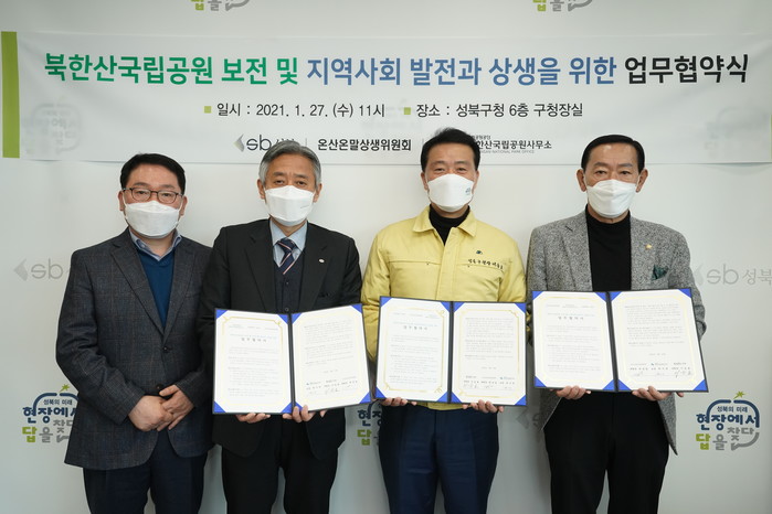 서울 성북구가 27일 온산온말상생위원회·국립공원공단 북한산국립공원사무소와 북한산국립공원 보전 및 정릉동 지역사회 상생발전을 위한 업무협약을 체결했다. 구는 관계기관 협의 등 각종 행정업무를 지원하고 상생위원회는 북한산국립공원 환경정화 등 정책들을 제안하게 된다. 사진은 협약식에서 이승로 구청장(오른쪽에서 두 번째)과 관계자들이 기념촬영을 하는 모습. (사진제공=성북구청)
