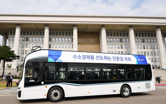 12일 서울 여의도 국회에서 열린 '국회 수소버스 시승식'에서 수소연료전지버스가 시범 운행을 하고 있다. 국회는 국가기간 중 최초로 양산형 수소연료전지버스를 도입했다.