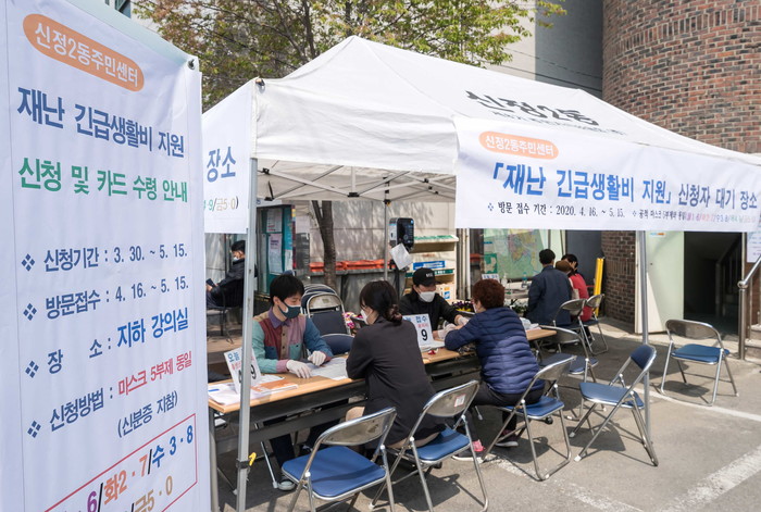 서울 양천구는 최근 신정2동 주민센터 앞에 야외 대기 부스를 설치하고 주민들로부터 재난긴급생활비 신청 관련 안내를 했다. 야외 부스는 정부 차원의 ‘고강도 사회적 거리두기’가 지속됨에 따라 설치됐다. 사진은 주민들이 신청 안내를 받고 있는 모습. (사진제공=양천구청)