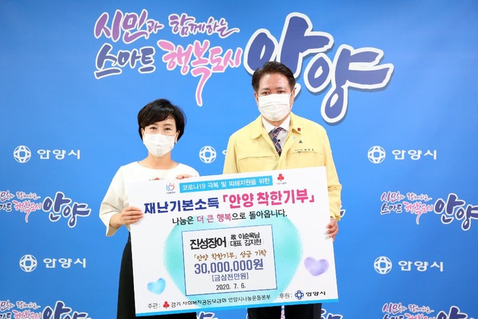 경기 안양시가 최근 지역내 향토음식점 진성장어로부터 코로나19 장기화로 어려움에 처한 저소득층과 홀몸노인을 위해 써달라며 3000만원을 기탁 받았다. 사진은 최대호 시장(오른쪽)이 김지현 대표로부터 성금을 전달 받고 함께 기념촬영을 하는 모습. (사진제공=안양시청)