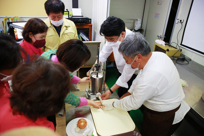 맹정호 충남 서산시장은 5일 인지면 나눔공장에서 인지면생활개선회원들과 '소시지만들기 농업체험'을 했다. 사진은 맹 시장(오른쪽에서 두 번째)이 직접 소시지를 만들고 있는 모습. (사진제공=서산시청)