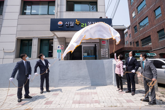 지난 11일 서울 양천구 신월누리복지센터가(가로공원로 101) 제막식을 열고 본격 운영에 들어갔다. 사진은 김수영 구청장(오른쪽 세번째)이 관계자들과 제막식을 진행하고 있는 모습. (사진제공=양천구청)
