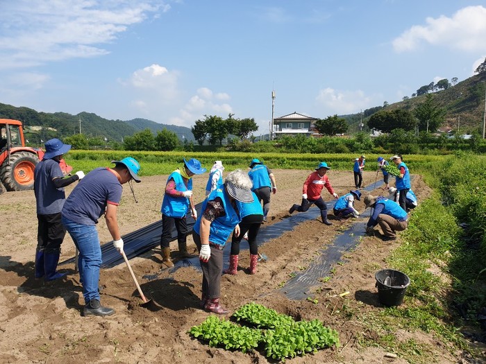 경기 양평군 양동면 행복돌봄추진단에서는 26일 저소득취약계층을 위해 양동면 삼산리 소재 휴경지에서 ‘사랑의 김장 배추 모종 식재’ 행사를 실시했다. 사진은 참여자들이 배추 모종을 심고 있는 모습. (사진제공=양평군청)