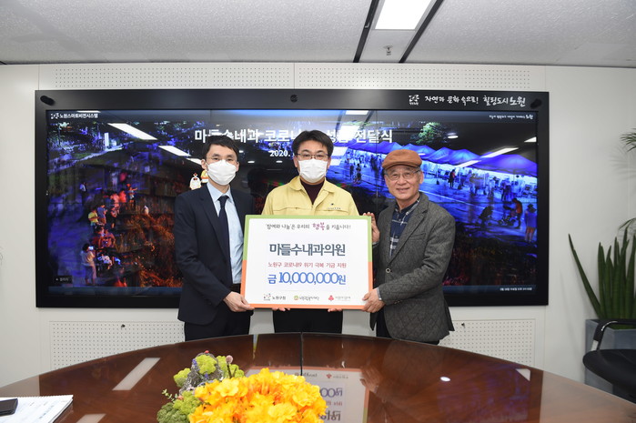 서울 노원구는 18일 상계동에 위치한 마들수내과로부터 코로나19로 어려움을 겪는 구민들에게 힘을 보태기 위한 성금 1000만원을 전달받았다. 사진은 오승록 구청장(가운데)이 성금을 전달받은 후 관계자들과 기념촬영을 하는 모습. (사진제공=노원구청)