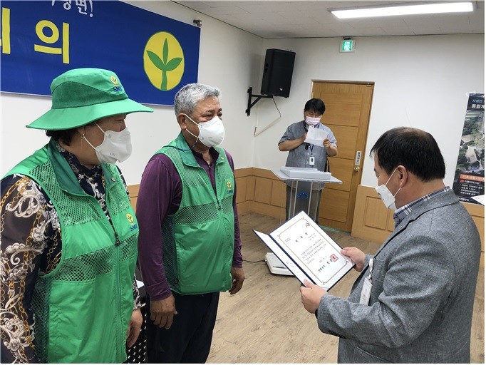 경기 양평군 지평면은 최근 지평새마을회 회원 63명을 제2기 명예사회복지공무원으로 신규 위촉했다. 명예사회복지공무원은 무보수 명예직으로, 지역내 위기가구 발굴·복지정보 제공 등 주변의 어려운 이웃들을 살피며 돕는 역할을 하게 된다. 사진은 위촉식에서 위촉장을 수여하고 있는 모습. (사진제공=양평군청)